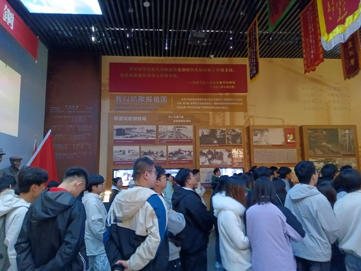 为了深入推进我院思想政治理论课教学的实效性,中国近现代史教研室按照《中国近现代史纲要》课程教学大纲的要求和实践教学计划的安排,2025年10月18日下午,由叶后坡、马宁两位教师带领九十余名学生前往“齐心协力建包钢”主题展馆开展“大思政课”实践研学活动。