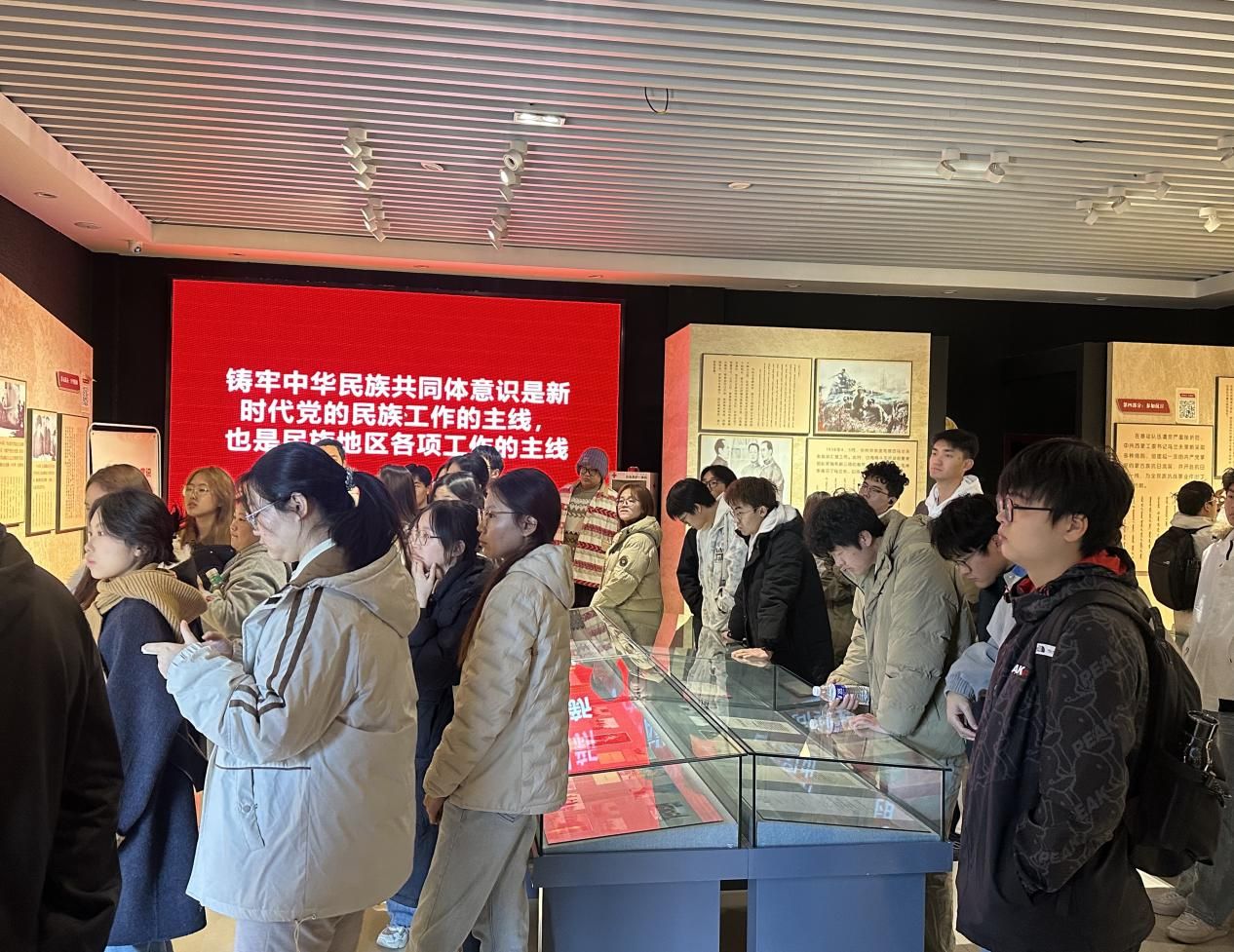 中午一点,师生一行前往包头市铸牢中华民族共同体意识体验馆。展厅内,通过多媒体互动、沉浸式影像、实物陈列等多种展示形式,全方位呈现了中华民族多元一体格局的形成历程,生动诠释了新时代铸牢中华民族共同体意识的丰富内涵与实践路径。从各民族交往交流交融的历史足迹,到新时代各民族共同团结奋斗、共同繁荣发展的丰硕成果,师生们深刻认识到,中华民族共同体意识是国家统一之基、民族团结之本、精神力量之魂,纷纷表示要做中华民族共同体意识的坚定拥护者、积极传播者和自觉践行者。